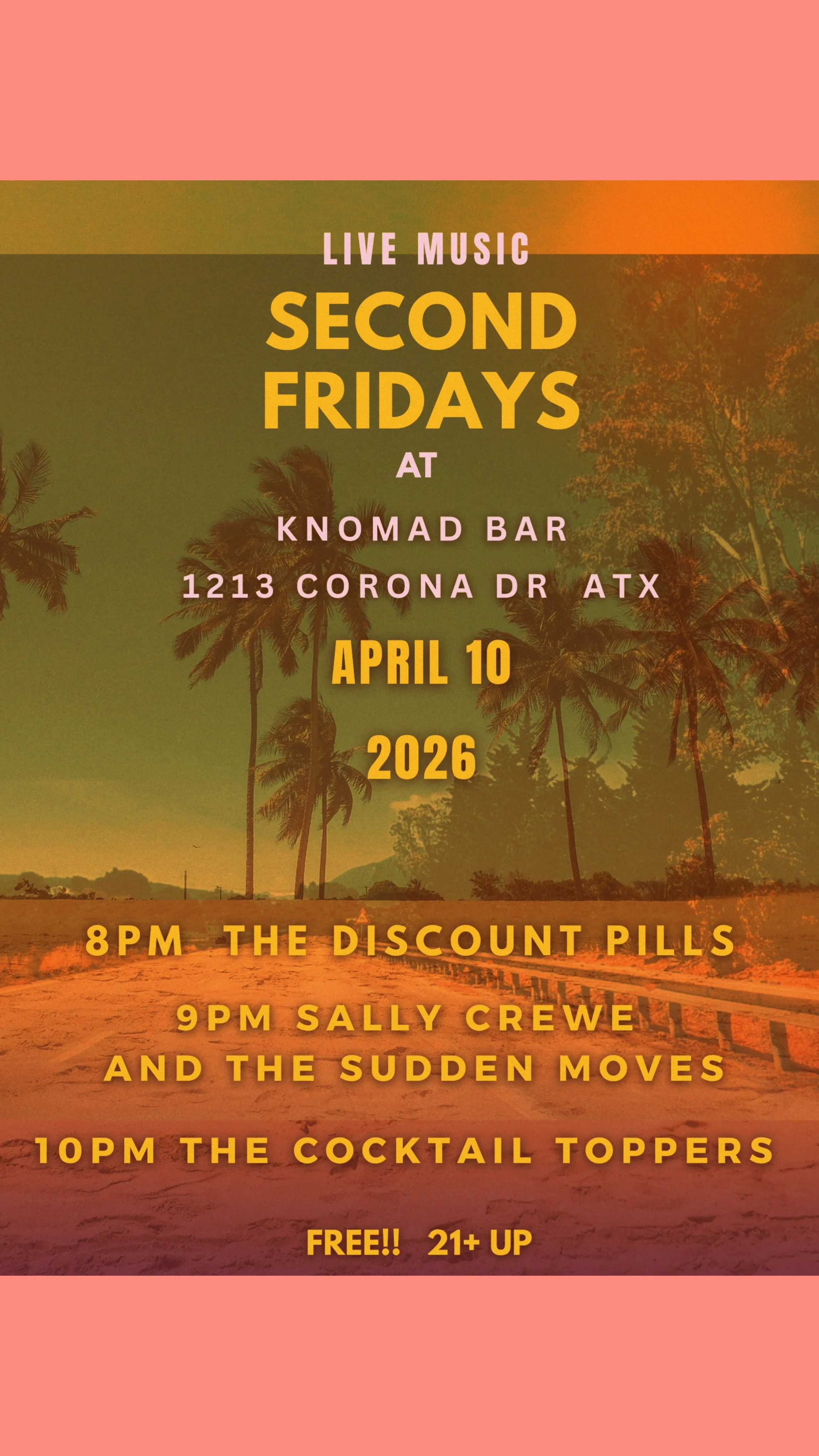 Sally Crewe and the Sudden Moves at Knomad (AUSTIN TX) Friday, April 10, 2026 8:00 PM 11:00 PM 20:00 23:00 Google Calendar ICS Brent joins Sally and her Crewe on an all indie-rock billAlso featuring The Discount Pills and The Cocktail Toppers